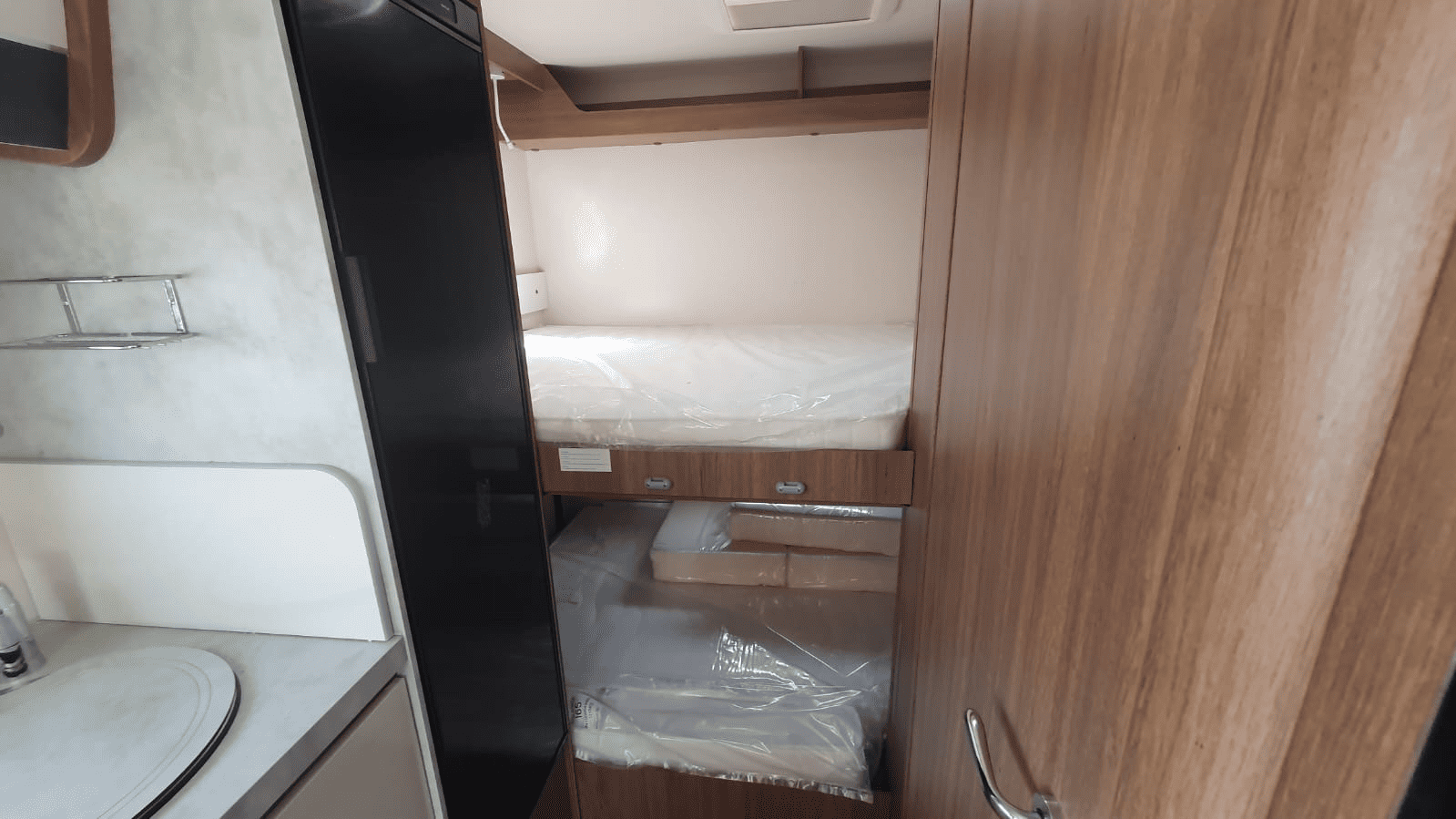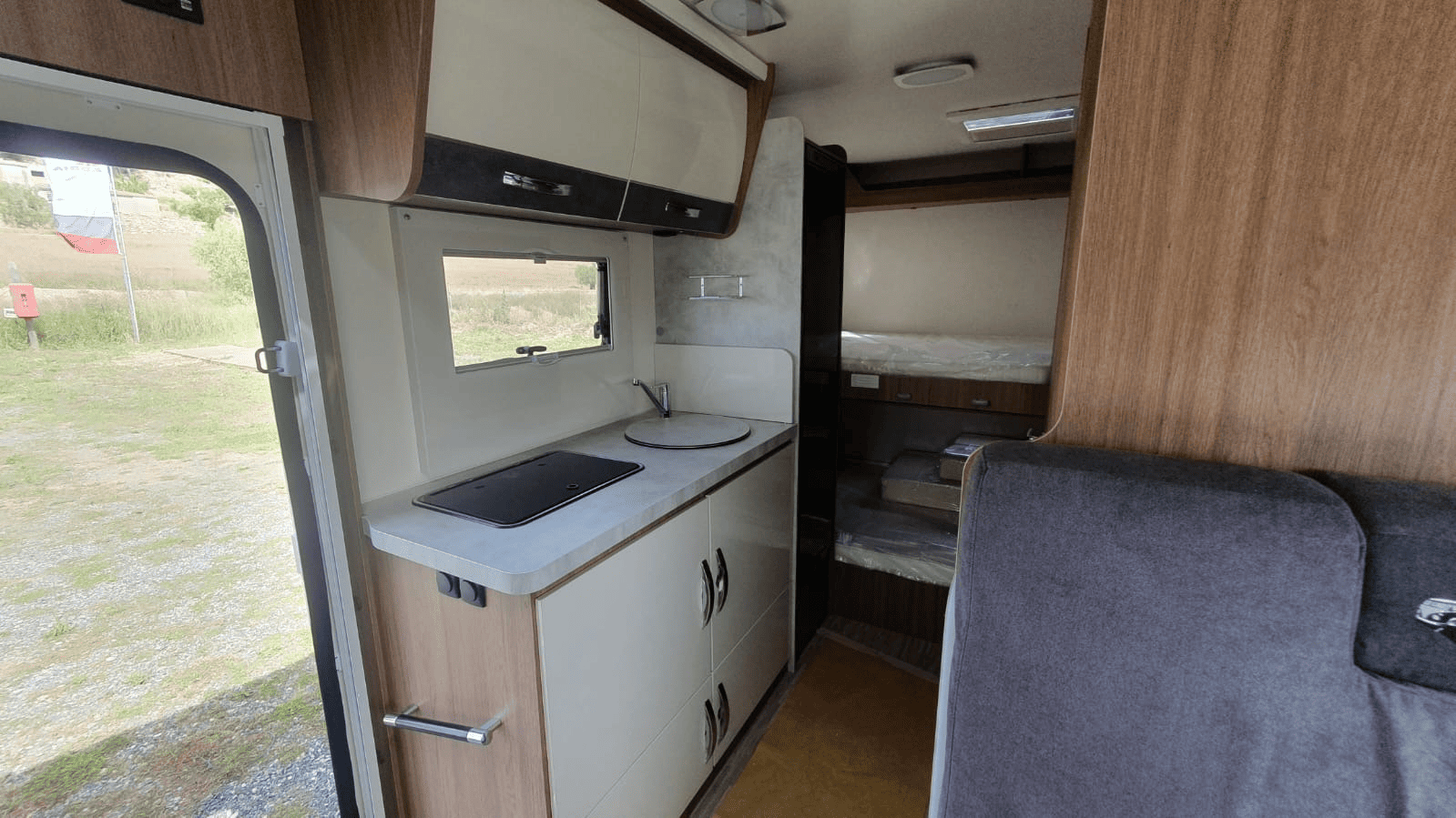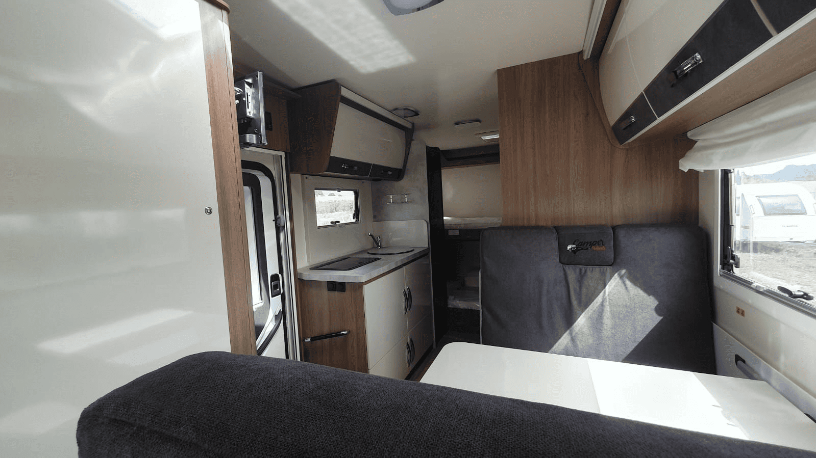 En su interior destacan tres camas: dos literas traseras y una cama capuchina sobre la cabina. La calefacción es con Combi 4 diésel (Truma), lo que garantiza confort en cualquier estación. El acceso al habitáculo es cómodo gracias a una puerta XL con ventana. Además, incorpora materiales duraderos en interior y una garantía de 10 años contra filtraciones (“Body Protection”) para mayor tranquilidad.